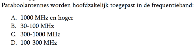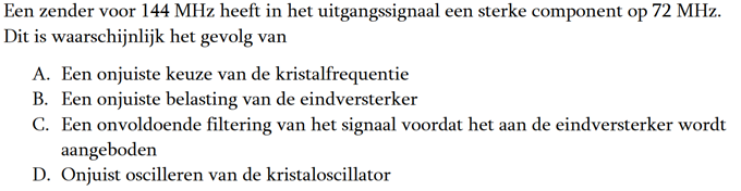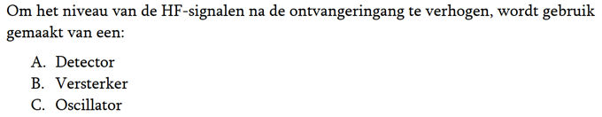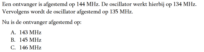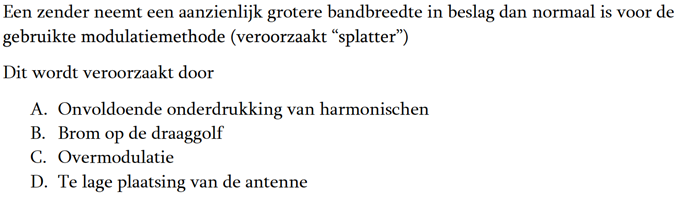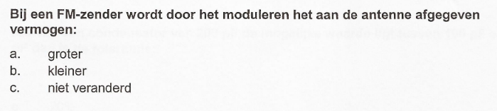 | 07-01-2018 | De vraag van ronde 1648: Een VHF-zender wordt in frequentie gemoduleerd met een lf-signaal. Het juiste antwoord is a. |
