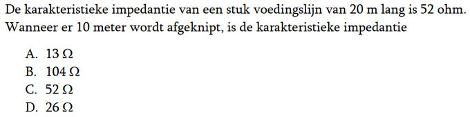| 14-01-2018 | De vraag van ronde 1649: Een halvegolf lijnstuk (dat zijn twee kwartgolf lijnstukken in serie) heeft een transformatieverhouding van: Het juiste antwoord is c. |