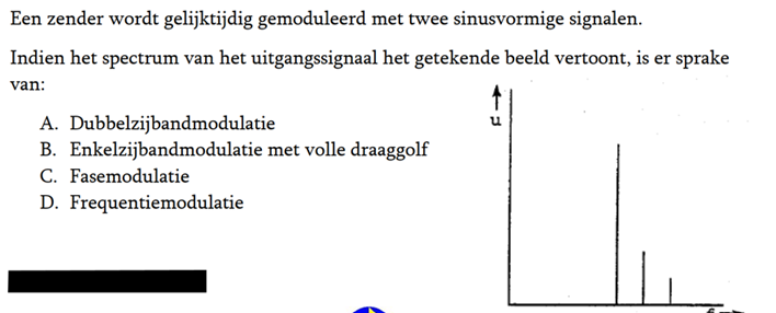 | 21-09-2025 | De vraag van ronde 2050: Bewering 1: Een enkelzijbandzender met onderdrukte draaggolf wordt gemoduleerd met een spraaksignaal. De klasse van uitzending is J3B.