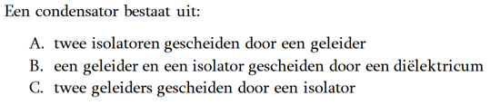 | 23-07-2017 | De vraag van ronde 1624: Een condensator wordt gevormd door twee geleiders met daartussen een diëlectricum. Het juiste antwoord is c . |