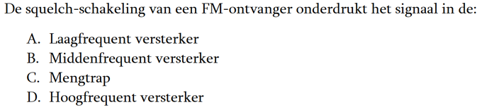 | 23-02-2025 | De vraag van ronde 2020: De squelch-schakeling van een FM-ontvanger onderdrukt het signaal in de: Het juiste antwoord is a. |