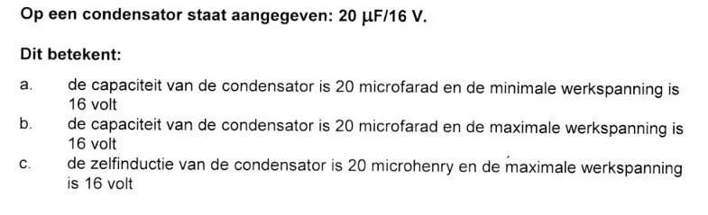 | 22-06-2025 | De vraag van ronde 2037: Een condensator met een capaciteit van 200 μF is een: Het juiste antwoord is c. |