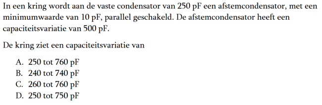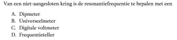 | 03-12-2017 | De vraag van ronde 1643: De resonantiefrequentie van een afstemkring wordt bepaald door: Het juiste antwoord is: a |
