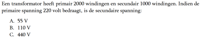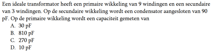 | 12-11-2017 | De vraag van ronde 1640: Een ideale transformator heeft primair 500 windingen en secundair 100 windingen. 73 de Sipke Het juiste antwoord is d. |