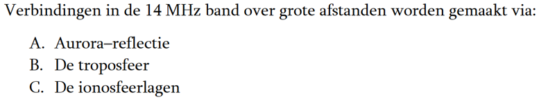 | 05-08-2018 | De vraag van ronde 1678: Na zonsondergang worden ver verwijderde radiostations in de 3,5 MHz band hoorbaar. Het juiste antwoord is c. |