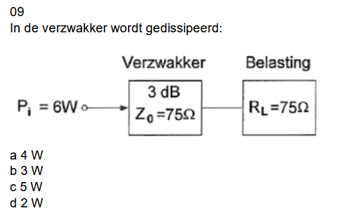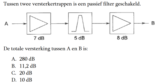 Het juiste antwoord is B. Volgens de tabel is de winst 4 db,echter de kabelverliezen zijn 1 db.De totale winst is dus 3 db. 100 Watt +3 db =200 Watt. |